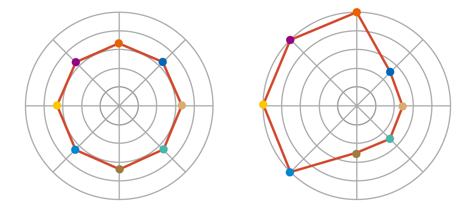 そしてこれらのポイントを総合的に評価するために"レーダーチャート"を作ります。