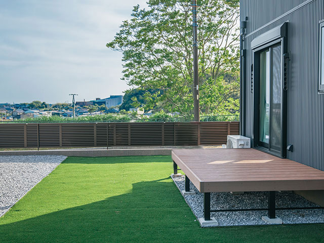 玄関部分にはゆったりした屋根付きポーチがあり、リビングから外につながるウッドデッキも取り付け可能です。