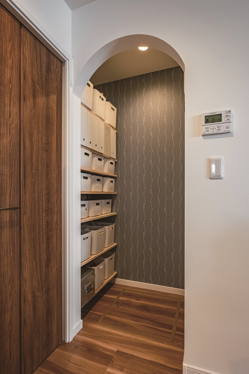 キッチンから数歩でつながる大容量のパントリーは、アーチの垂れ壁がやさしい雰囲気でとてもキュートです。
